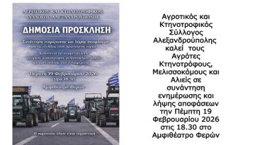 18 Φεβρουάριος 2026 Μήνυμα – Συνάντηση: Ο Αγροτικός και Κτηνοτροφικός Σύλλογος Αλεξανδρούπολης απευθύνει δημόσια πρόσκληση για συνάντηση ενημ