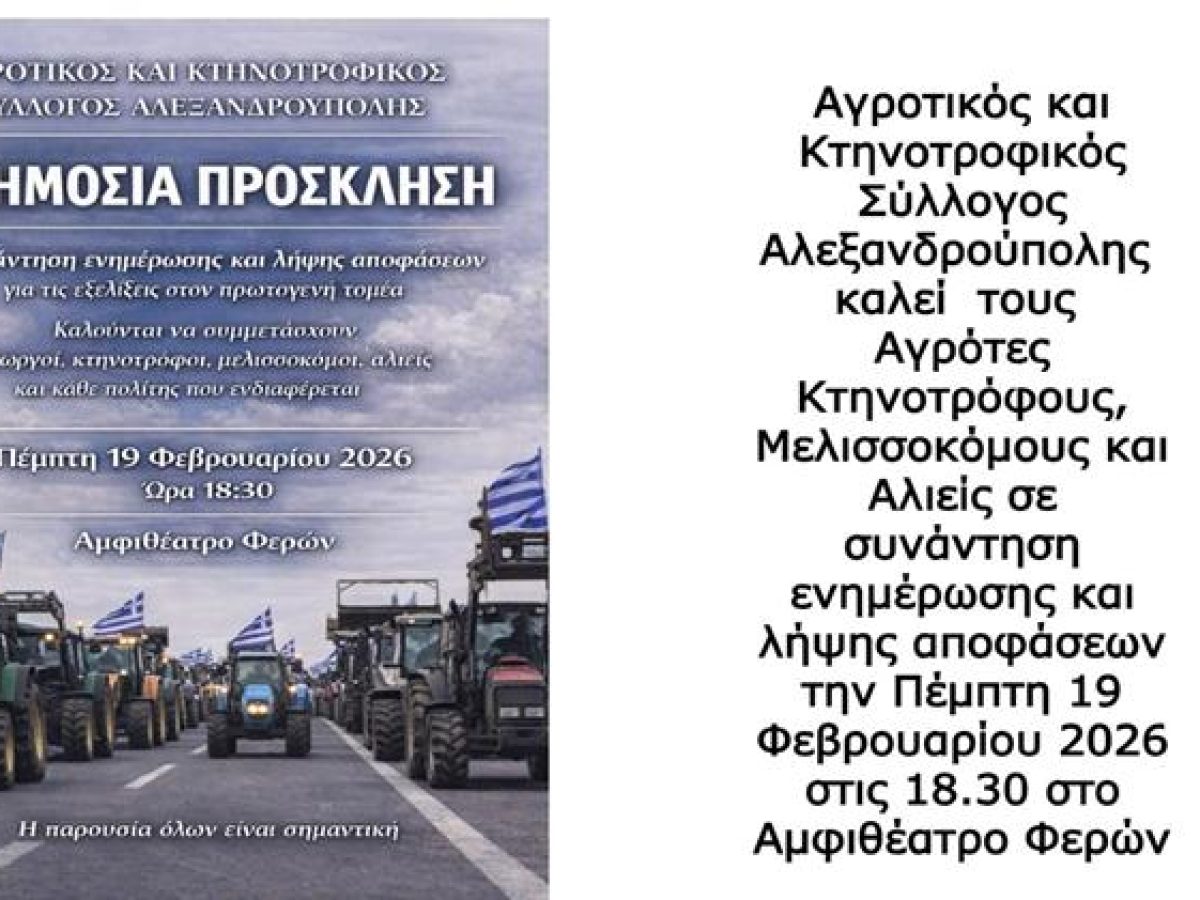 Ο Αγροτικός και Κτηνοτροφικός Σύλλογος Αλεξανδρούπολης απευθύνει δημόσια πρόσκληση για συνάντηση ενημέρωσης και λήψης αποφάσεων, καλώντας τους αγρότες, κτηνοτρόφους, μελισσοκόμους, αλιείς και κάθε πολίτη που ενδιαφέρεται για τις εξελίξεις του πρωτογενούς τομέα να δώσουν το παρόν. Το ραντεβού έχει οριστεί για την Πέμπτη 19 Φεβρουαρίου 2026 στις 18.30, στο Αμφιθέατρο Φερών, με στόχο όχι μόνο την ανταλλαγή πληροφοριών αλλά τη διαμόρφωση κοινής στάσης απέναντι στις προκλήσεις που επηρεάζουν άμεσα την παραγωγή και το εισόδημα.